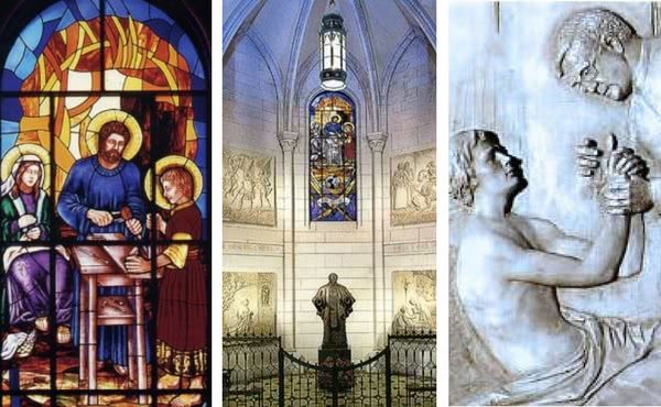 No baixo-relevo inferior esquerdo evoca-se a figura de Josemaria Escrivá orando de joelhos diante da Virgem Maria na Cuesta de la Vega. Uma placa, na própria capela, conta a história. No baixo-relevo inferior direito está representado o Fundador do Opus Dei a atender um doente agonizante. Este doente, de etnia cigana, faleceu no Hospital Geral de Madri com grande contrição, num domingo de fevereiro de 1932. Aprendi de um cigano - recordava S. Josemaria - a fazer um ato de contrição”.