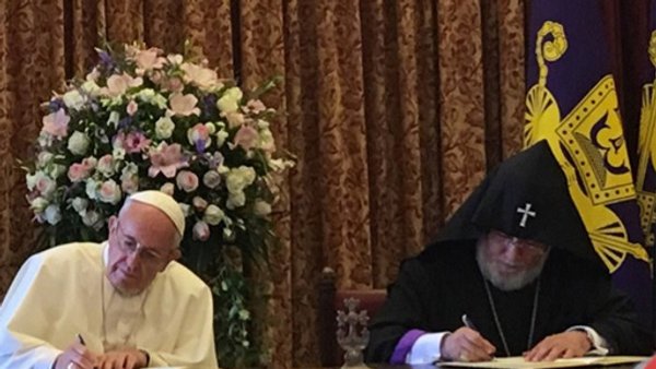 اليوم في إتشميادزين المقدسة، المركز الروحي للأرمن أجمعين، نحن، البابا فرنسيس وكاريكين الثاني، كاثوليكوس عموم الأرمن، نرفع عقولنا وقلوبنا في شكر لله القدير، على التقارب المستمر والمتزايد، في الإيمان وفي المحبة، بين الكنيسة الرسولية الأرمنية والكنيسة الكاثوليكية، عبر الشهادة المشتركة لرسالة الإنجيل، في عالم تمزقه الصراعات، عَطِش إلى العزاء والرجاء. ونحمد الثالوث القدوس، الآب والابن والروح القدس، على إتاحة الفرصة لنا للقدوم إلى هذه الأراضي الكتابية، أرارات، والتي تقف كتذكير بأن الله سيكون حماية لنا وخلاص، على الدوام. يسرنا روحيا أن نذكر أنه في عام 2001، بمناسبة الذكرى 1700 لإعلان المسيحية دينًا لأرمينيا، قد زار القديس يوحنا بولس الثاني أرمينيا، وكان شاهدًا على صفحة جديدة من العلاقات الوّدية والأخوية بين الكنيسة الأرمنية الرسولية والكنيسة الكاثوليكية. ونحن ممتنون لكوننا قد نلنا نعمة المشاركة معًا في ليتورجيا رسمية في بازيليك القديس بطرس في روما، 12 أبريل/نيسان 2015، والتي قد التزمنا خلالها، بمعارضة كلّ أشكال التمييز والعنف، وأحيينا ذكرى الضحايا الذين ذكرهم الإعلان المشترك بين قداسة البابا يوحنا بولس الثاني وقداسة كاريكين الثاني، أي "إبادة مليون ونصف من المسيحيين الأرمن، التي تُعرف عادة بأول إبادة جماعية في القرن العشرين" (27 سبتمبر/أيلول 2001).