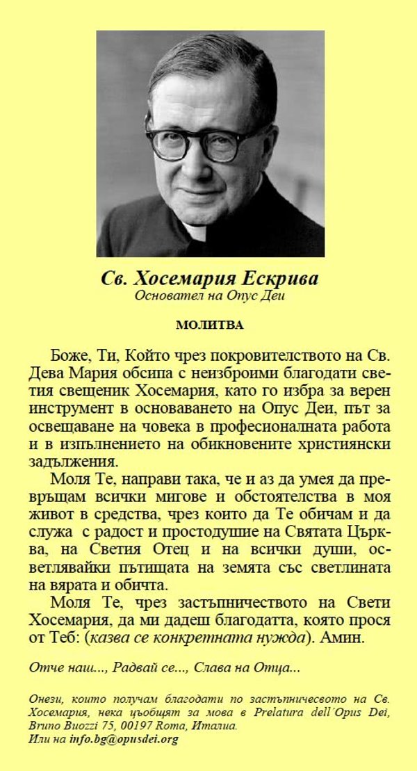 Моля Те, чрез застъпничеството на Свети Хосемария, да ми дадеш благодатта, която прося от Теб (казва се конкретната нужда). Амeн.