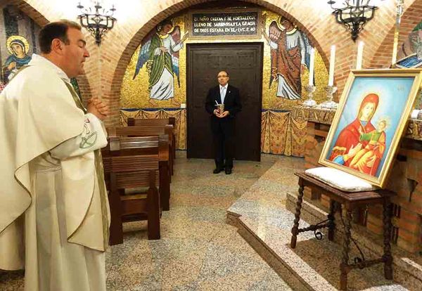 Груптата бе посрещната от ректора на светилището, отец Хавиер Мора, който благослови картината и я постави в изложбената зала в криптата на Торесюдад (www.torreciudad.org). Там тя ще бъде почитана от всички вярващи, но най-вече от бъдещите български поклонници.