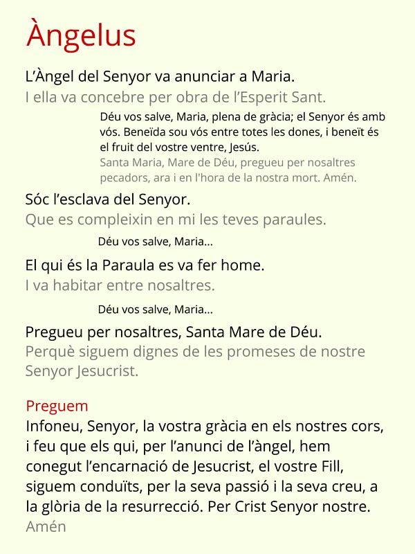 Déu vos salve, Maria, plena de gràcia; el Senyor és amb vós. Beneïda sou vós entre totes les dones, i beneït és el fruit del vostre ventre, Jesús.