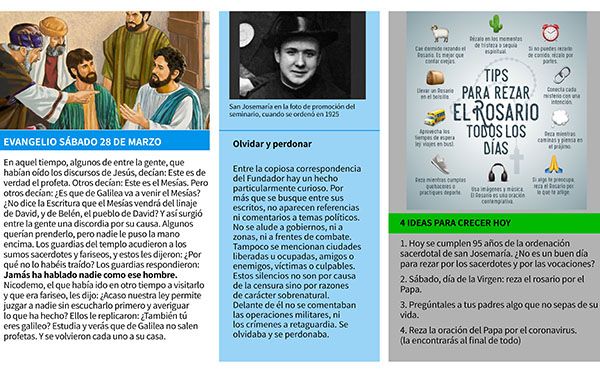 I així, cada dia, ofereixen un objectiu, un repte o bé una recomanació cultural. La primera proposta va ser fer un horari. Després: esport, encàrrecs, treball, tracte amb Déu. I també impulsar el servei als altres. En aquests dies de confinament també és possible donar-se als altres amb infinits detalls de servei; el projecte Rei Mides t'ofereix idees i recursos.