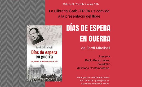 El dilluns 9 d'octubre el catedràtic d'història Pablo Pérez López, juntament amb l'autor, Jordi Miralbell, presentaran a la llibreria Troa de Barcelona el llibre "Días de espera en guerra", de l'editorial Palabra, sobre els 40 dies que sant Josepmaria va estar a Barcelona.