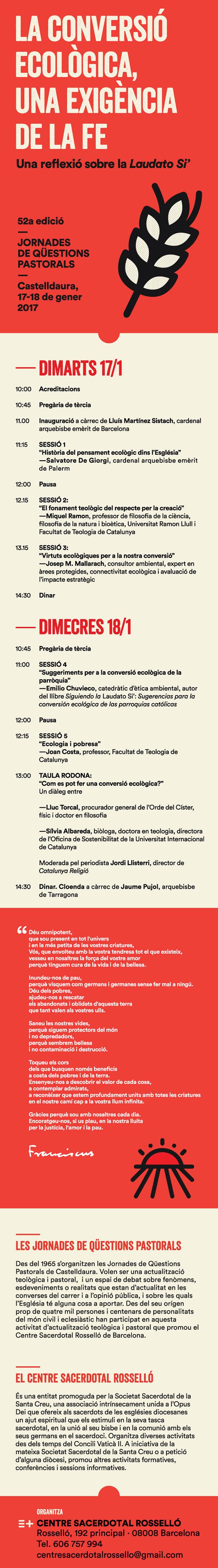 Amb el títol “La conversió ecològica, una exigència de la fe”, les 52 Jornades de Qüestions Pastorals de Castelldaura se celebraran els dies 17 i 18 de gener del 2017 a Castelldaura (Premià de Dalt).