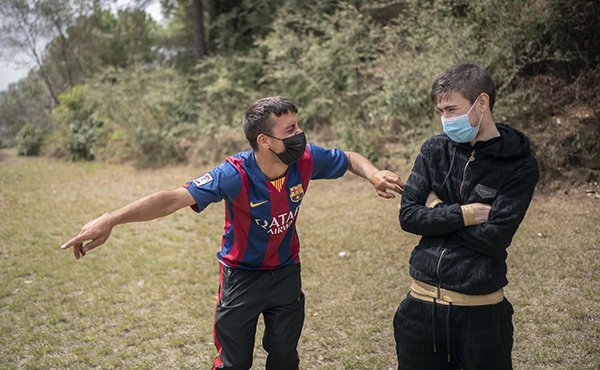 «Penseu en una situació en la qual ho hàgiu passat malament i rieu-vos-en», els diu l’Isidro, fundador de l’oenagé T’Acompanyem. «Si penso en una cosa dolenta no riuré, prefereixo pensar en una cosa bona», diu el Borja. «Tots tenim les nostres llàgrimes», l’anima el Diamé. Aquest jove d’origen senegalès va perdre la seva feina com a monitor en una fundació quan va començar el primer estat d’alarma i, un any després, encara no n’ha pogut trobar cap altra. «Vaig estar nou anys per aconseguir els papers. He treballat de tot. Ara vull aprendre anglès i estudiar informàtica, a veure si surt alguna cosa», explica.