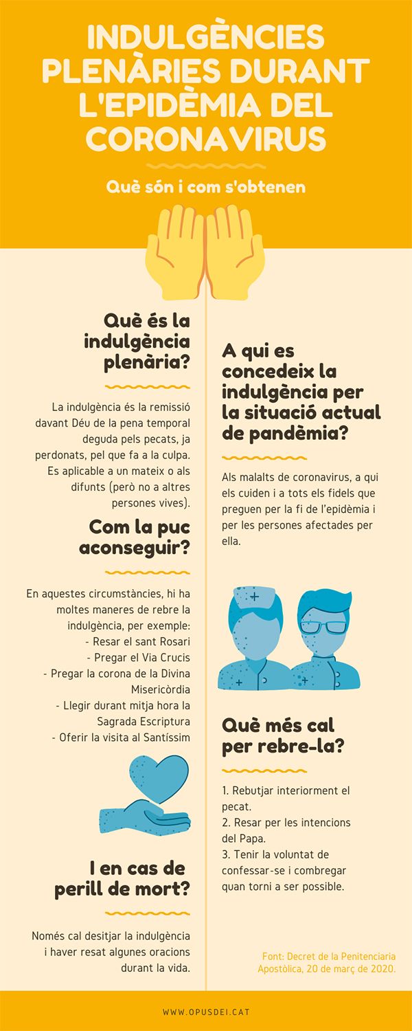 Es concedeix la Indulgència plenària als fidels malalts de coronavirus, subjectes a quarantena per ordre de l'autoritat sanitària als hospitals o a les seves pròpies cases si, amb esperit després de qualsevol pecat, s'uneixen espiritualment a través dels mitjans de comunicació a la celebració de la Santa Missa, a la pregària del sant Rosari, a la pràctica pietosa del Via Crucis o altres formes de devoció, o si almenys resen el Credo, el Parenostre i una piadosa invocació a la Santíssima Mare de Déu, oferint aquesta prova amb esperit de fe en Déu i de caritat cap als germans, amb la voluntat de complir les condicions habituals (confessió sacramental, comunió eucarística i oració per les intencions del Sant Pare), tot just els sigui possible.