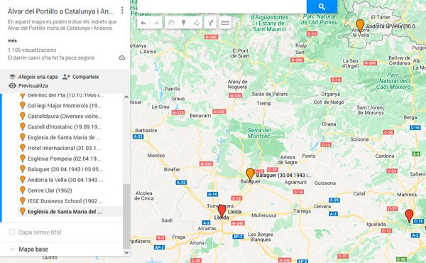 En aquest mapa podeu localitzar alguns indrets on Àlvar del Portillo va visitar en diverses ocasions Catalunya i Andorra. Aquests indrets estan dividits en dos grups d'11 punts cada un, el primer “Àlvar del Portillo sense sant Josepmaria” i el segon grup “Àlvar del Portillo amb sant Josepmaria”. Va trepitjar per primer cop terres catalanes l'any 1929 i l'última vegada l'any 1994, dos mesos abans del seu traspàs.