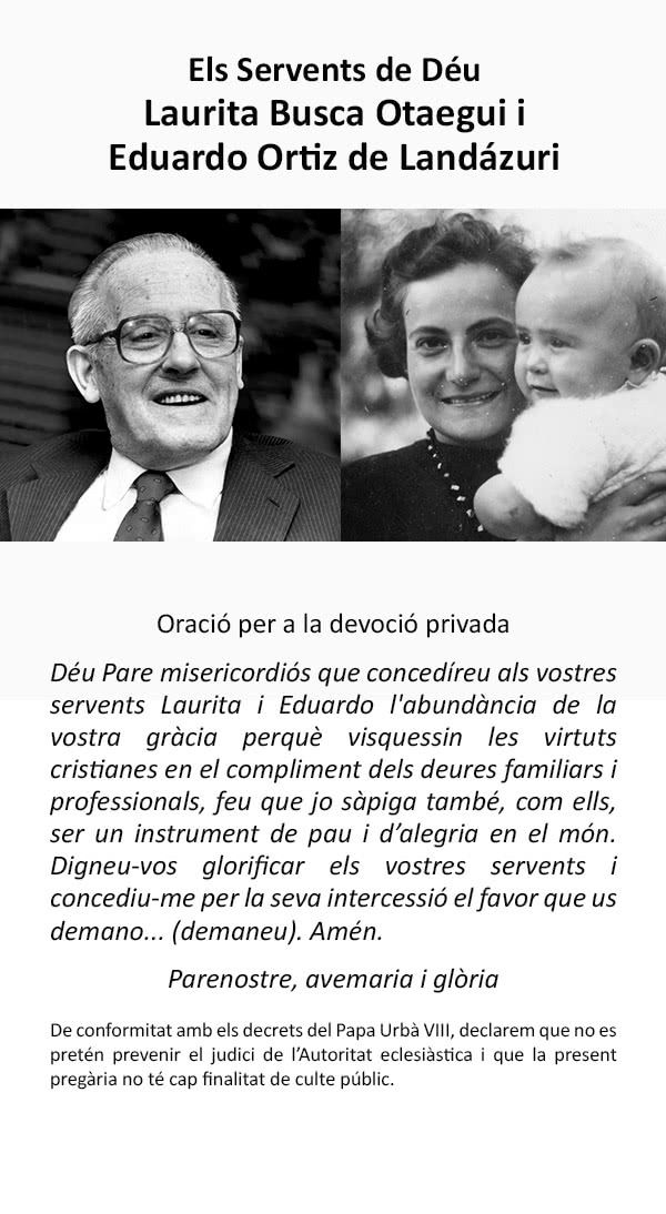 Déu Pare misericordiós que concedíreu als vostres servents Laurita i Eduardo l'abundància de la vostra gràcia perquè visquessin les virtuts cristianes en el compliment dels deures familiars i professionals, feu que jo sàpiga també, com ells, ser un instrument de pau i d’alegria en el món. Digneu-vos glorificar els vostres servents i concediu-me per la seva intercessió el favor que us demano... (demaneu). Amén.