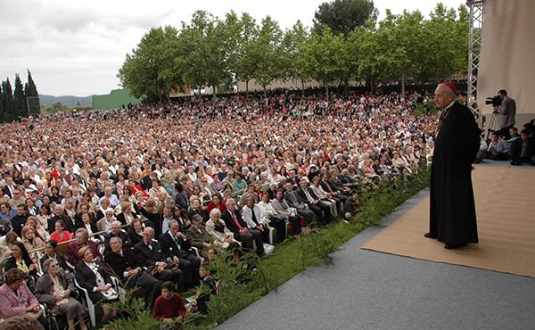 La tertúlia va tenir lloc a les 11:30 h del matí. El camp de futbol de l’estadi era ple de gom a gom, amb milers de persones arribades de tota Catalunya. El temps era molt bo. En connectar-li el micròfon, les seves primeres paraules van ser de record i agraïment a sant Josepmaria, amb qui havia estat a Viaró al novembre de 1972.