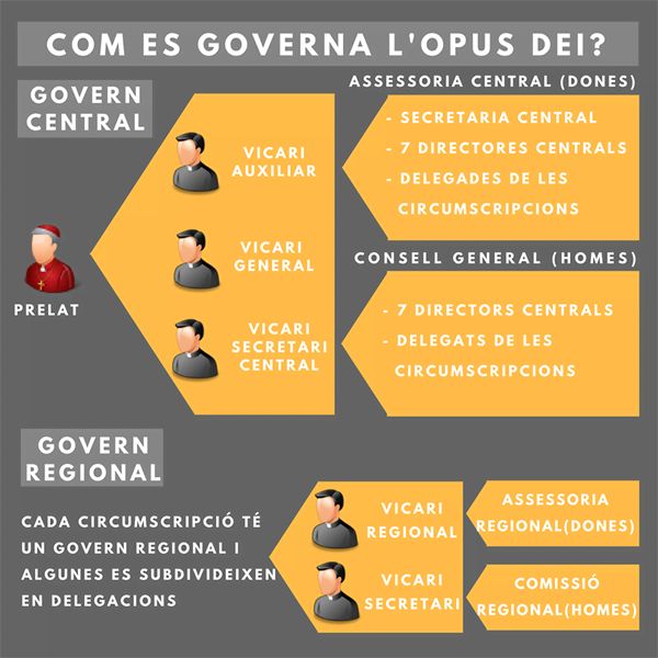 En la tasca de govern de la Prelatura, el prelat és ajudat per dos consells que exerceixen les funcions per a tota la Prelatura, segons es tracti dels homes o de les dones.