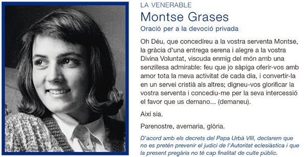 Oh Déu, que concedíreu a la vostra serventa Montse, la gràcia d'una entrega serena i alegre a la vostra Divina Voluntat, viscuda enmig del món amb una senzillesa admirable: feu que jo sàpiga oferir-vos amb amor tota la meva activitat de cada dia, i convertir-la en un servei cristià als altres; digneu-vos glorificar la vostra serventa i concediu-me per la seva intercessió el favor que us demano... ( demaneu). Així sia.