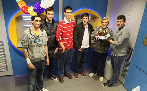 Santi, Luis, Dani, Dani, Matías i Pol amb el caixer vestit de festa.