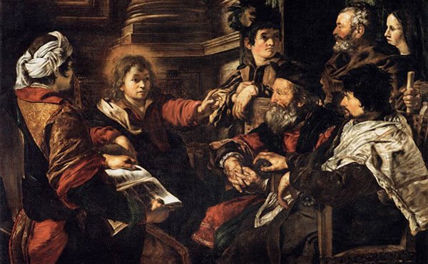 Transcorregué així el segon dia, amb angoixa i dolor. Van tornar una vegada i una altra a recórrer els llocs que havien freqüentat, fins que al tercer dia de recerca que el van trobar en el Temple, segurament en un dels salons situats al costat dels atris, que els escribes utilitzaven per impartir les seves lliçons. Era una escena freqüent als dies de festa: el mestre, des d’un setial elevat, per ser ben vist i sentit, amb un rotllo del llibre sagrat a les seves mans, explicava algun passatge de l'Escriptura als oients, que escoltaven asseguts al sòl. De tant en tant, l’escrivà feia alguna pregunta a l’auditori, a la qual responien els alumnes més avantatjats. Així van trobar Josep i Maria a Jesús: assegut entre els mestres de la Llei, escoltant-los i fent-los preguntes. Tots els qui el sentien es meravellaven de la seva intel·ligència i de les seves respostes (Lc 2, 46-47).