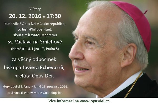 V úterý 20.12.2016 v 17:30 bude vikář Opus Dei v České republice, o. Jean-Philippe Huet, sloužit mši svatou v chrámu sv. Václava na Smíchově za věčný odpočinek biskupa Javiera Echevarríu, preláta Opus Dei, který odešel k Pánu v Římě 12. prosince 2016 , na svátek Panny Marie Guadalupské.