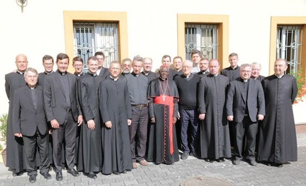 Třetím pilířem je Panna Maria. Nikdo nemůže žít bez matky. Všichni jsme spojeni se svou matkou a otcem. Ježíš to věděl, a proto nám dal Marii za matku. „Ženo, hle, tvůj syn.“ A učedníkovi řekl: „Hle, tvoje matka“ (srov. Jan 19,25-27). Kněz nemůže zanedbávat růženec, nemůže jít spát bez modlitby růžence. Růženec je modlitba, která nás spojuje s Marií. V Africe nosí matka své dítě na zádech převázané pláštěm. Růženec je plášť, který nás spojuje s Marií, abychom cítili její mateřské teplo. Vím, že to děláte každý den, ale trvám na tom, abyste růženec nezanedbávali. Papež Jan Pavel II. nás naučil toto: všichni patříme Marii. Proto prosme Marii, abychom byli kněžími, kteří milují svět tak, jak ho miloval Ježíš Kristus. Modlete se k Marii za svůj lid, modlete se k Marii za Církev. Velmi často je to Panna Maria, která nám ukazuje, že jí záleží na našem duchovním růstu. Zjevila se v Lurdech, zjevila se ve Fatimě, zjevila se v Medžugorji, zjevila se v Kibeho v Africe. Při každé příležitosti se Panna Maria stará o naši spásu.