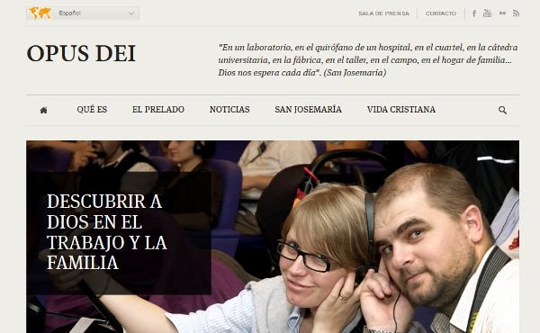 c) Menu v horní části se skládá z pěti oddílů: Co je to Opus Dei, Prelát, Zprávy, Svatý Josemaría, Křesťanský život. Každý oddíl je rozbalovací a umožňuje tak přístup k různým pododdílům. Nová struktura webových stránek usnadňuje a urychluje přístup k různým tématům. Kromě toho umožňuje zobrazit celé bohatství článků, které se během let nahromadily.