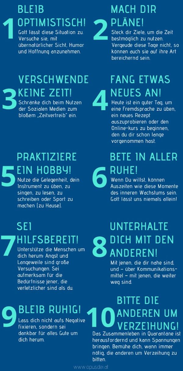 8. Sei hilfsbereit! Unterstütze die Menschen um dich herum: Angst und Langeweile sind große Versuchungen. Sei aufmerksam für die Bedürfnisse jener, die verletzlicher sind als du.