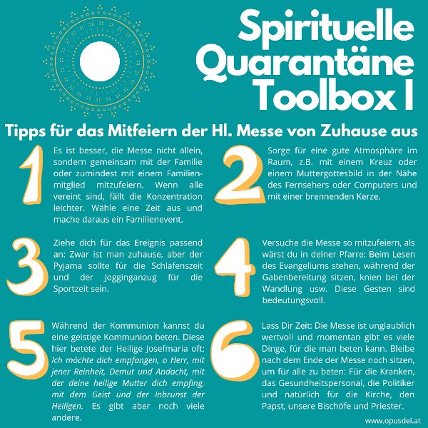 6. Lass Dir Zeit: Die Messe ist unglaublich wertvoll und momentan gibt es viele Dinge, für die man beten kann. Bleibe nach dem Ende der Messe noch sitzen, um für alle zu beten: Für die Verstorbenen, Kranken, das Gesundheitspersonal, die Regierungsbeamten und natürlich für die Kirche, den Papst, unsere Bischöfe und Pfarren.
