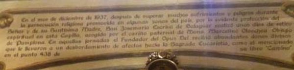 „Nach Überwindung unzähliger Schwierigkeiten und Leiden während der religiösen Verfolgung in einzelnen Landesteilen und offensichtlich unter dem besonderen Schutz des Herrn und seiner heiligen Mutter hielt der hl. Josémaría Escrivá de Balaguer im Monat Dezember 1937 in dieser Kapelle, die ihm in väterlicher Fürsorge von Msgr. Marcelino Oleachea, dem Bischof von Pamplona, zur Verfügung gestellt worden war, Besinnungstage. Im Verlauf dieser Tage empfing der Gründer des Opus Dei reiche Gnaden, die ihn zu einer überschwänglichen Liebe zur Eucharistie führten, wie sich aus dem Punkt 438 des Buches „Der Weg“ ersehen lässt.