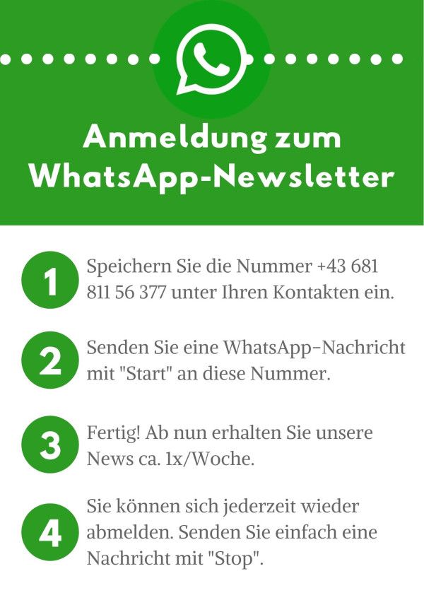 Sie können den WhatsApp-Newsletter jederzeit abbestellen, indem Sie uns eine Nachricht mit „Stopp“ schicken.