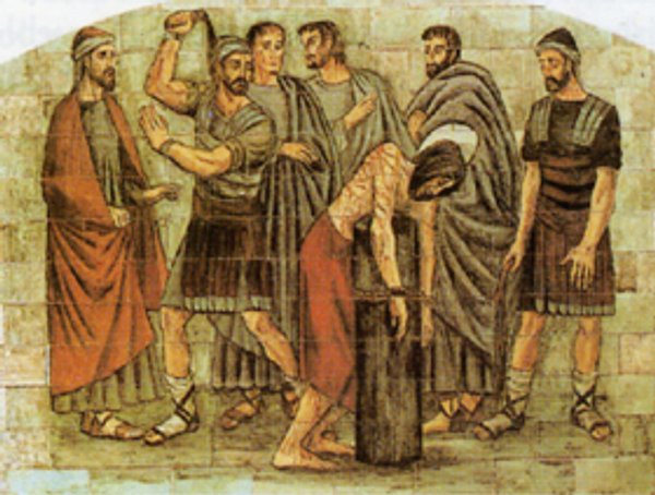 Das Geschrei der Menge schwillt an: Kreuzige Ihn! Kreuzige Ihn! (Mk 15,14) Und Pilatus, der das Volk zufriedenstellen will, gibt ihnen den Barrabas frei und läßt Jesus geißeIn.