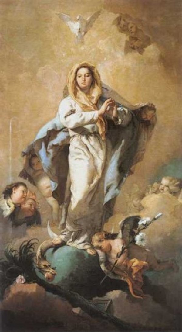 Ein großes Zeichen erschien am Himmel: "Eine Frau mit einer Krone von zwölf Sternen auf ihrem Haupt, umkleidet mit der Sonne, der Mond zu ihren Füßen" (Offb 12,1). Maria, die Jungfrau ohne Makel, hat den Sündenfall Evas wiedergutgemacht: sie hat mit ihrem unbefleckten Fuß der Höllenschlange den Kopf zertreten.