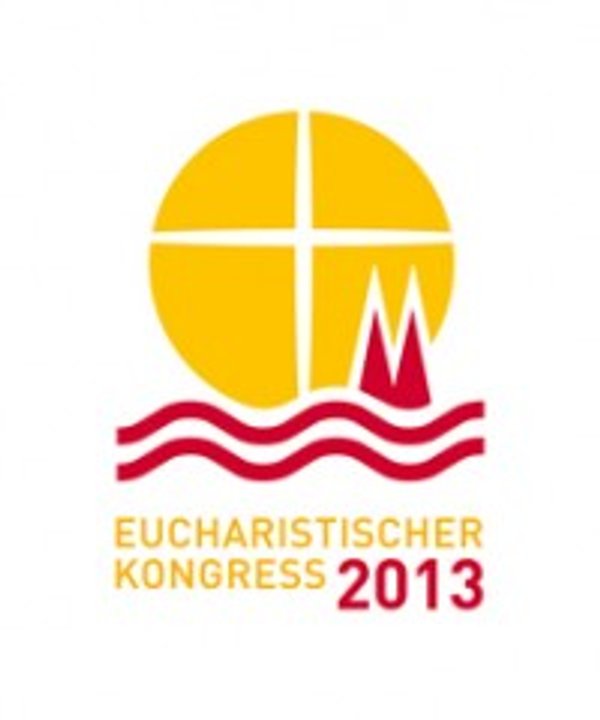 Das Logo des Eucharistischen Kongresses vorgestellt zeigt im Mittelpunkt die kreisrunde Hostie. In das Rund ragt die Silhouette des Kölner Doms als Verweis auf den Veranstaltungsort. Zwei geschlängelte Linien am unteren Rand erinnern an das Wasser der Taufe und darüber hinaus an den Rhein, sie können im Hinblick auf das Leitwort aber auch als Weg angesehen werden. [jb]