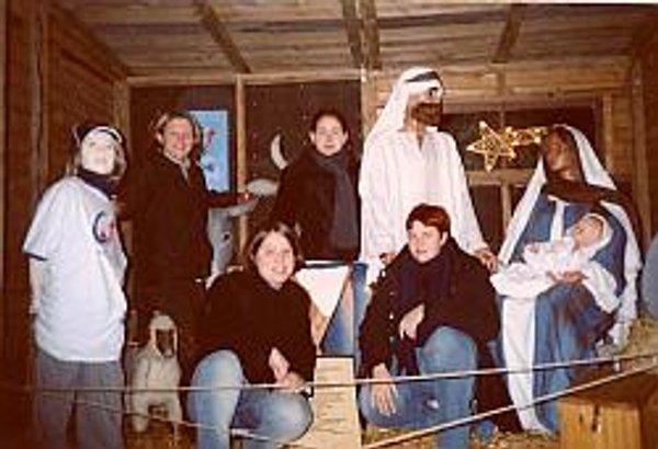 Die Krippe auf dem Domvorplatz blickt auf den WJT 2005. Sie wurde wieder vom Ausbildungszentrum Schweidt (www.hauswirtschaftliche-ausbildungszentren.de) aufgestellt. In diesem Jahr weist der Hirtenjunge die Betrachter auf den Weltjugendtag in Köln 2005 hin. Patricia und Nadine haben ihn mit einem T-Shirt und einer Kappe mit dem WJT-Embleme ausstaffiert. Alle sind eingeladen, sich auf den Weg zu Jesus zu machen, der hier als Kind in der Krippe unweit vom Kölner Dom liegt. „Kommt, lasset uns anbeten“, heißt das Leitmotiv für den Weltjugendtag in der Stadt der Heiligen Drei Könige.