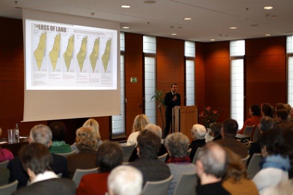 Maksan führte ein mit vier parallelen Karten der zionistischen Landnahme in Palästina. Damit war schon einiges gesagt. Nüchtern, ohne vorschnelle Schuldzuweisung entwickelte er die Geschichte Israels bis zum heutigen Tag.