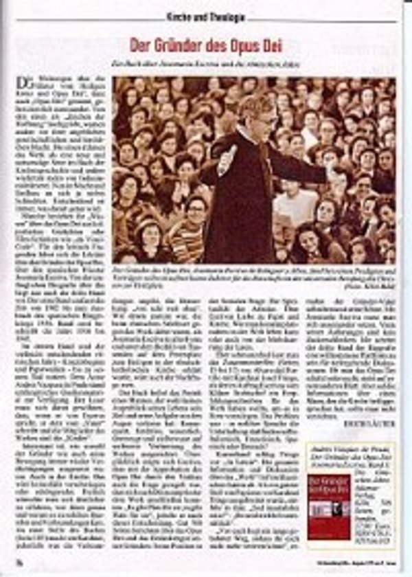 Manche beziehen ihr „Wissen” über das Opus Dei aus kolportierten Gerüchten oder Film-Schinken wie „da Vinci-Code”. Für den kritisch Fragenden lohnt sich die Lektüre über den Gründer des Opus Dei, über den spanischen Priester Josemaría Escrivá. Von der umfänglichen Biografie über ihn liegt nun auch der dritte Band vor. Der erste Band umfasst die Zeit von 1902 bis zum Ausbruch des spanischen Bürgerkriegs 1936. Band zwei beschreibt die Jahre 1936 bis 1945.