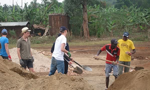 Der Arbeitsalltag in der afrikanischen Hitze ist anstrengend und fordernd. Aber er beschert uns wichtige Erfahrungen wie den direkten Kontakt zur Bevölkerung und besonders das bittere Gefühl zu sehen, wie langsam und mühsam es sich ausschließlich mit Hammer, Säge und Spaten arbeiten lässt. Es gibt keine größeren Hilfsmittel. Um 13:00 Uhr fahren wir zurück nach Hause. Verdreckt und hungrigerwartet uns eine warme Mahlzeit mit reichlich Hähnchen und Reis oder Matokee – einem Püree aus Kochbananen, einem der Nationalgerichte Ugandas. Halbwegs erholt geht es um 14:15 Uhr wieder zur Arbeit. Als um 17 Uhr die zweite Schicht vorbei ist, gibt esTee und Kaffee und gegen 20 Uhr bis zum Abendbrot Zeit zur freien Verfügung. Der Abend wird mit geistlichem Input, Rosenkranzgebet und anschließendem Beisammensein gefüllt, welches nicht selten in lebhafte gesellschaftliche Diskussionen zwischen den verschiedenen Kulturen mündet, immer aber freundschaftlich verläuft.