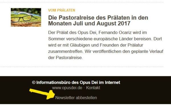 Um den Newsletter wieder abzubestellen, klicken Sie in Ihrem letzten erhaltenen Newsletter im schwarzen Kasten am Ende auf den Text: Newsletter abbestellen (siehe den gelben Pfeil im unteren Bild).