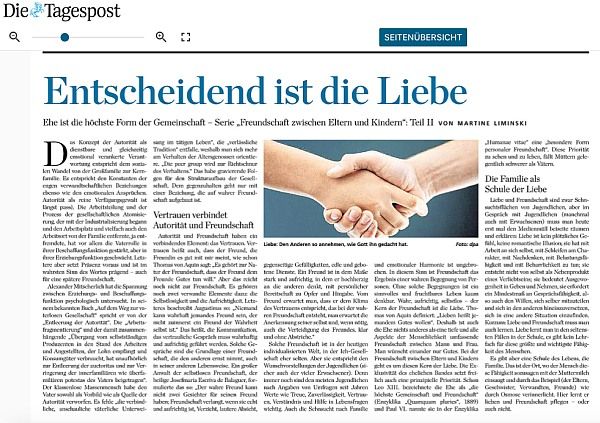 Solche Freundschaft ist in der heutigen individualisierten Welt, in der Ich-Gesellschaft eher selten. Aber sie entspricht den Wunschvorstellungen der Jugendlichen (sicher auch der vieler Erwachsener). Denn immer noch sind den meisten Jugendlichen nach Angaben von Umfragen seit Jahren Werte wie Treue, Zuverlässigkeit, Vertrauen, Verständnis und Hilfe in Lebensfragen wichtig. Auch die Sehnsucht nach Familie und emotionaler Harmonie ist ungebrochen. In diesem Sinn ist Freundschaft das Ergebnis einer wahren Begegnung von Personen. Ohne solche Begegnungen ist ein sinnvolles und fruchtbares Leben kaum denkbar. Wahr, aufrichtig, selbstlos – der Kern der Freundschaft ist die Liebe. Thomas von Aquin definiert: „Lieben heißt jemandem Gutes wollen“. Deshalb ist auch die Ehe nichts anderes als eine tiefe und alle Aspekte der Menschlichkeit umfassende Freundschaft zwischen Mann und Frau. Man wünscht einander nur Gutes. Bei der Freundschaft zwischen Eltern und Kindern geht es um diesen Kern der Liebe. Die Exklusivität des ehelichen Bandes setzt freilich auch eine prinzipielle Priorität. Schon Leo XIII. bezeichnete die Ehe als „die höchste Gemeinschaft und Freundschaft“ (Enzyklika „Quamquam pluries“, 1889) und Paul VI. nannte sie in der Enzyklika „Humanae vitae“ eine „besondere Form personaler Freundschaft“. Diese Priorität zu sehen und zu leben, fällt Müttern gelegentlich schwerer als Vätern.