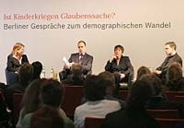 Die Referenten des 4. Berliner Demographiegesprächs - Prälat Christoph Bockamp, Landesbischöfin Margot Käßmann und Professor Gisela Trommsdorff - betonten am Mittwoch gemeinsam die Wichtigkeit einer stabilen Ehe als Grundlage für das Aufwachsen von Kindern. Die letztlich unkündbare Beziehung der Eltern zum Kind brauche eine stabile Basis. In der Ehe zeige sich nach katholischer Auffassung eine „Berufung Gottes": „Man heiratet, um Kinder zu haben", so Christoph Bockamp, Regionalvikar des Opus Dei in Köln. „Kinderkriegen hat mit Gottvertrauen zu tun", ergänzte die niedersächsische Landesbischöfin. Die Ehe sei eine wunderbare Lebensform, „die Lebenslust und Lebenslast mit Kindern" zu gestalten.