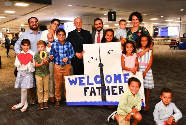 The Prelate of Opus Dei, Msgr. Fernando Ocáriz, arrived from Vancouver on Monday, August 12, touching down at Toronto Pearson International Airport at around 6:00 pm local time. Some families from the Toronto area greeted him upon his arrival at the airport. Daniel, an entrepreneur, was waiting with his wife Magda and their six children. After meeting the Father with a “Welcome to Toronto” banner which depicted the CN Tower, Canada’s tallest building, they gave the Father a Canadian coin with two footprints on it, a reminder of the footprints in the snow that St. Josemaria saw as a teenager. Afterwards, the whole family took a selfie with the Prelate.