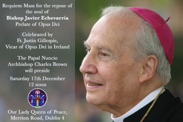 On the occasion of the death of the Prelate of Opus Dei, Bishop Javier Echevarría, a Requiem Mass will be celebrated for the repose of his soul on Saturday, December 17th at 12 noon in the Church of Our Lady Queen of Peace, Dublin.
