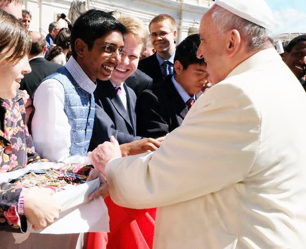 Then, in what seems like a flash, the Pope was right there in front of me. His countenance inspired confidence and I wasn’t as nervous as I expected to be. There were about eight of us from different countries —that I remember: India, Italy, Hong Kong, Kenya, Spain, the US— who were going to meet the Pope. I kept thinking of what I would say. When giving him the letter of Sebastian, along with others, he smiled and held both my hands as I told him my name and that I was from India.