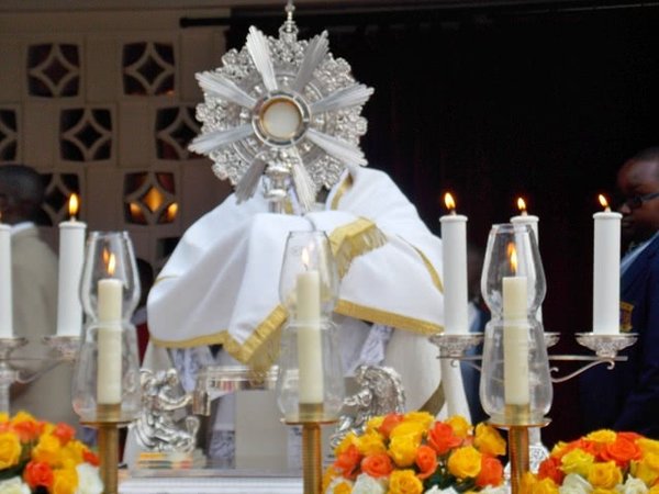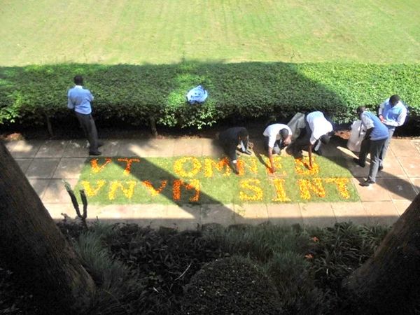 And so on Thursday, 11th June at 7:45 am, the solemn procession began from the chapel to the stage outside the school library. The Standard Three boys, who only last month received their First Holy Communion, led the procession, resplendent in their immaculate shashes, only matched by their bright countenances. As Our Lord took his walk on the carpet of roses, He was showered with petals from the balcony that intricately blended with solemn tunes of the school choir.