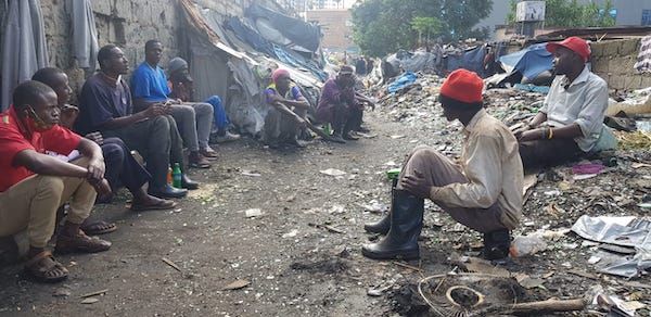 Peter, a middle aged man whose house in the slum was burnt and whose wife ran away with his child, lives at a place called “the base”. This is a common term for the place where street guys gather and sleep, often with no roof over their heads and sometimes with some canvas. Peter spent a year in hospital after the amputation of a finger. He could not pay the bill and so eventually escaped and lives in relative hiding from the authorities. His story is not uncommon in Nairobi.