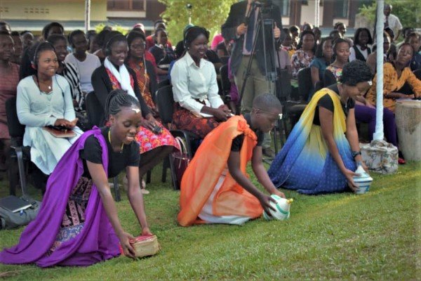 Yvonne, Juliana and Angela presented a Kinyarwanda dance with baskets. In line with the recent Apostolic Letter of the Holy Father, they gave him a gift of a Nativity scene made of wood and banana fibre.