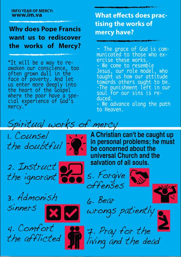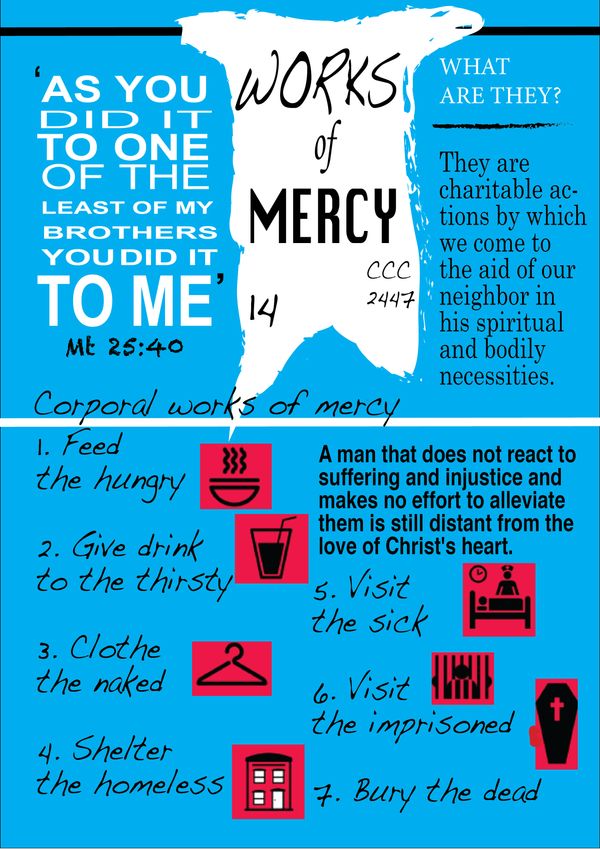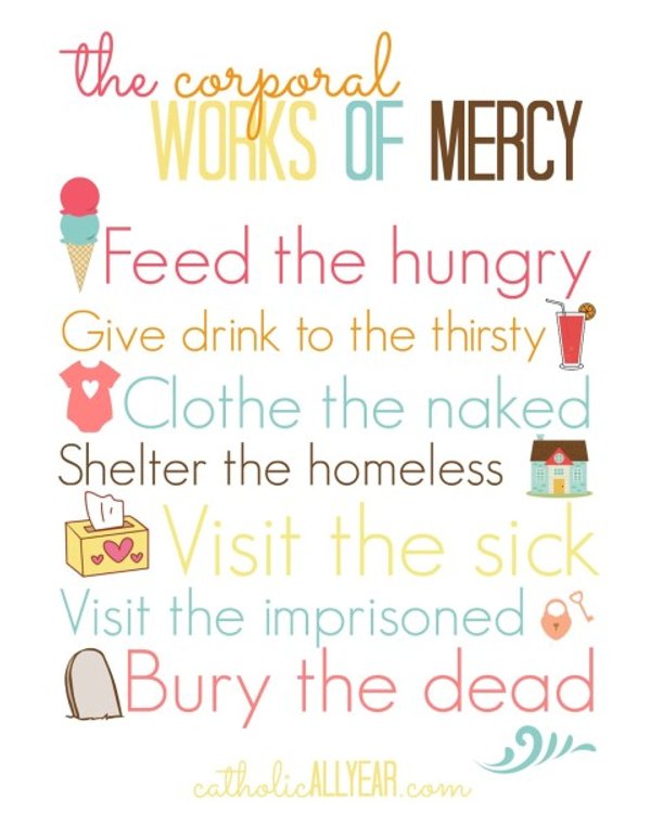 Jesus’ preaching presents to us these works of mercy so that we see whether we are living as his disciples or not. Let us rediscover the corporal works of mercy: feeding the hungry, giving a drink to the thirsty, clothing the naked, welcoming the foreigner, assisting the sick, visiting the imprisoned, burying the dead. And let us not forget the spiritual works of mercy: giving advice to the person who needs it, teaching the ignorant, correcting the one who is in error, consoling the person who is sad, forgiving offences, bearing with patience those who bother us, begging God for the living and the dead. (Pope Francis, Bull Misericordiae Vultus)
