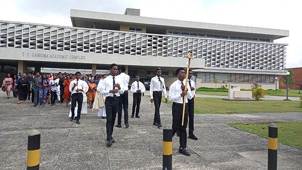 The procession started from the university chapel to the hostel area and terminated in the foyer of the School of Science and Technology with a benediction. The distance covered was not so long but good enough for the faithful to pray. In all, the procession took about forty minutes. Many people commented afterwards that it was a marked improvement from last year’s procession. Clearly, the more students participate in the sacred event, the more beautiful it is. The choristers did a good job with the songs that lifted the souls of the people.