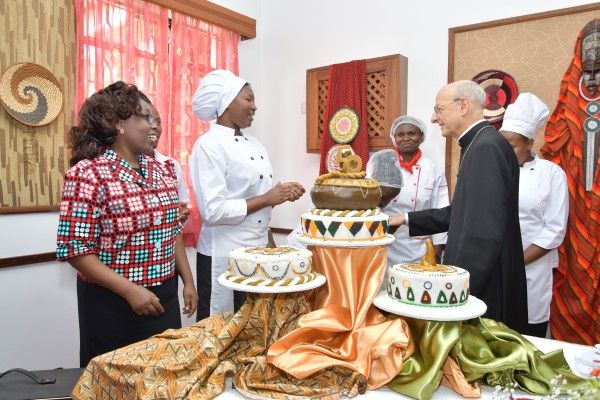 He then cut a beautifully decorated 50th Anniversary celebration cake. Jade and Venic, two Diploma students, then offered him a handy snack bag with the College logo containing pre packs of the cake that he could take along with him in his East African travels. The Father laughed and gave a blessing to all present before leaving. The students broke into song once more and the Father left the College accompanied by a dancing guard of honour of elated staff and students. It was the perfect climax to their Golden Jubilee Anniversary.