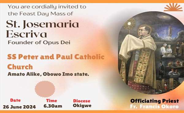 The 26th of June, anniversary of Saint Josemaría's death in 1975, is also his feast day and Masses will be celebrated in many cities around Nigeria. Information about his life, and favours granted through his intercession, is available at https://opusdei.org/en-ng/sain...