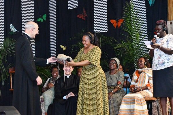 A number of those attending got a chance to present the Father with mementos. Nicholas – the first supernumerary in Africa – gave the Father a small statue of some shepherd boys; Leshan a shuka and decorative neckpieces both worn by men in his Maasai community. A group from the Coast, installed him as a Mijikenda elder in a summarised ceremony.