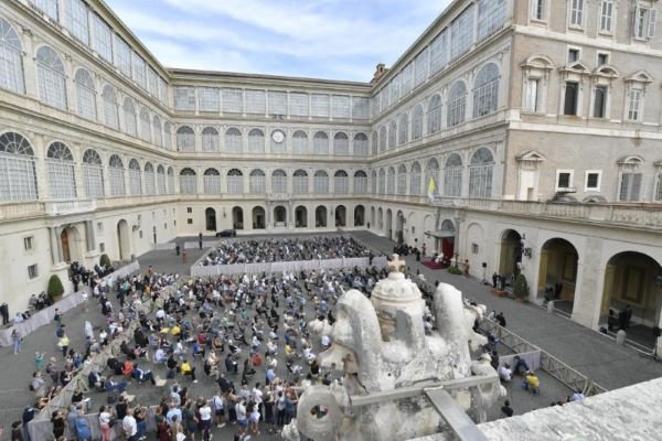 Pentecost is diametrically opposed to Babel (see Acts 2: 1-3), we heard at the beginning of the audience. The Holy Spirit, descending from above like wind and fire, sweeps over the community closed up in the Cenacle, infuses it with the power of God, and inspires it to go out and announce the Lord Jesus to everyone. The Spirit creates unity in diversity; He creates harmony. In the account of the Tower of Babel, there is no harmony; only pressing forward in order to earn. There, others are simply instruments, mere “manpower”, but here, in Pentecost, each one of us is an instrument, but a community instrument that participates fully in building up the community. Saint Francis of Assisi knew this well, and inspired by the Spirit, he gave all people, indeed creatures, the name of brother or sister (see LS 11; see Saint Bonaventure, Legenda maior, VIII, 6: FF 1145). Even brother wolf, remember.