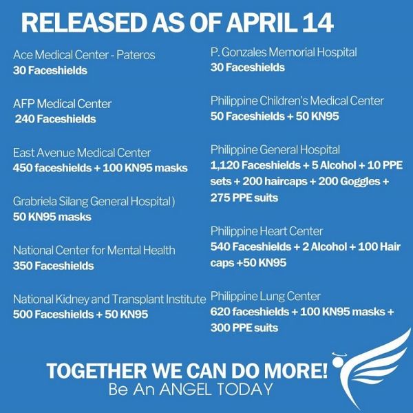 As of April 5, the group had released 3,260 face shields and 200 goggles to the Philippine General Hospital, Lung Center of the Philippines, Philippine Heart Center, East Avenue Medical Center, P. Gonzales Memorial Hospital, ACE Medical Center in Pateros, and the National Kidney Transplant Institute. Angels Today is scheduled to release more items.
