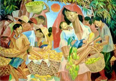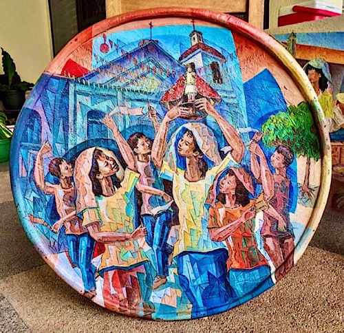 Sonia Yrastorza, president of Cebu Artists Incorporated, commented on the artwork below. She said, “As is usual with a Pepito painting, this one shows the three planar divisions and embodies what the artist considers significant: God, country and family.”