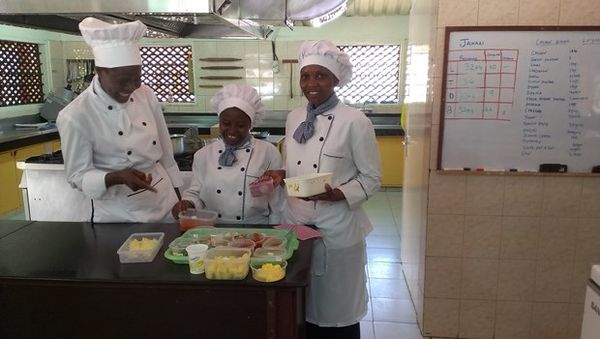 The actual preparation and production begins. The menu is displayed on the white board and each student takes her position. Today we are making a typical lunch from the coastal region of Kenya.The menu reads: Chicken biryani, Fried fish, Maharagwe ya nazi (beans with coconut), Viazi Karai (potatos, fried), Bhajia, wali wa nazi (rice with coconut) and Mchicha. It should be ready by 1.00pm. We have 36 guests.