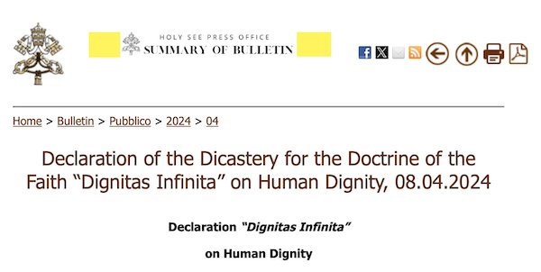 Dignitas Infinita (Latin for ‘Infinite Dignity’) is a text written by the Vatican department in charge of doctrinal teaching, the Dicastery for the Doctrine of Faith. But it has also been signed by Pope Francis, a sign that he wants to put his full weight behind it.
